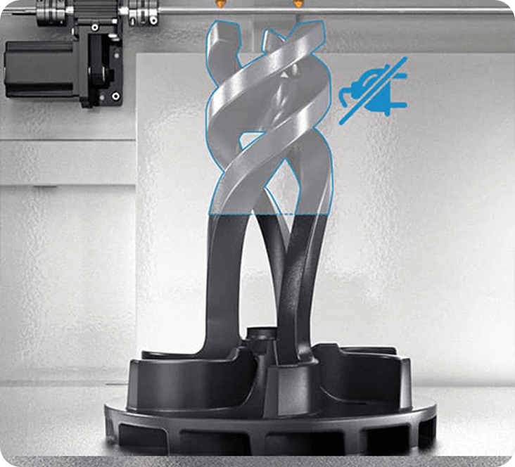 Sustav nadzora sigurnosnih vrata odmah zaustavlja ispis pri otvaranju. Obnova nakon nestanka struje, detekcija filamenta i automatski rezervni način rada mlaznice osiguravaju višednevne ispise bez gubitka proizvodnje.