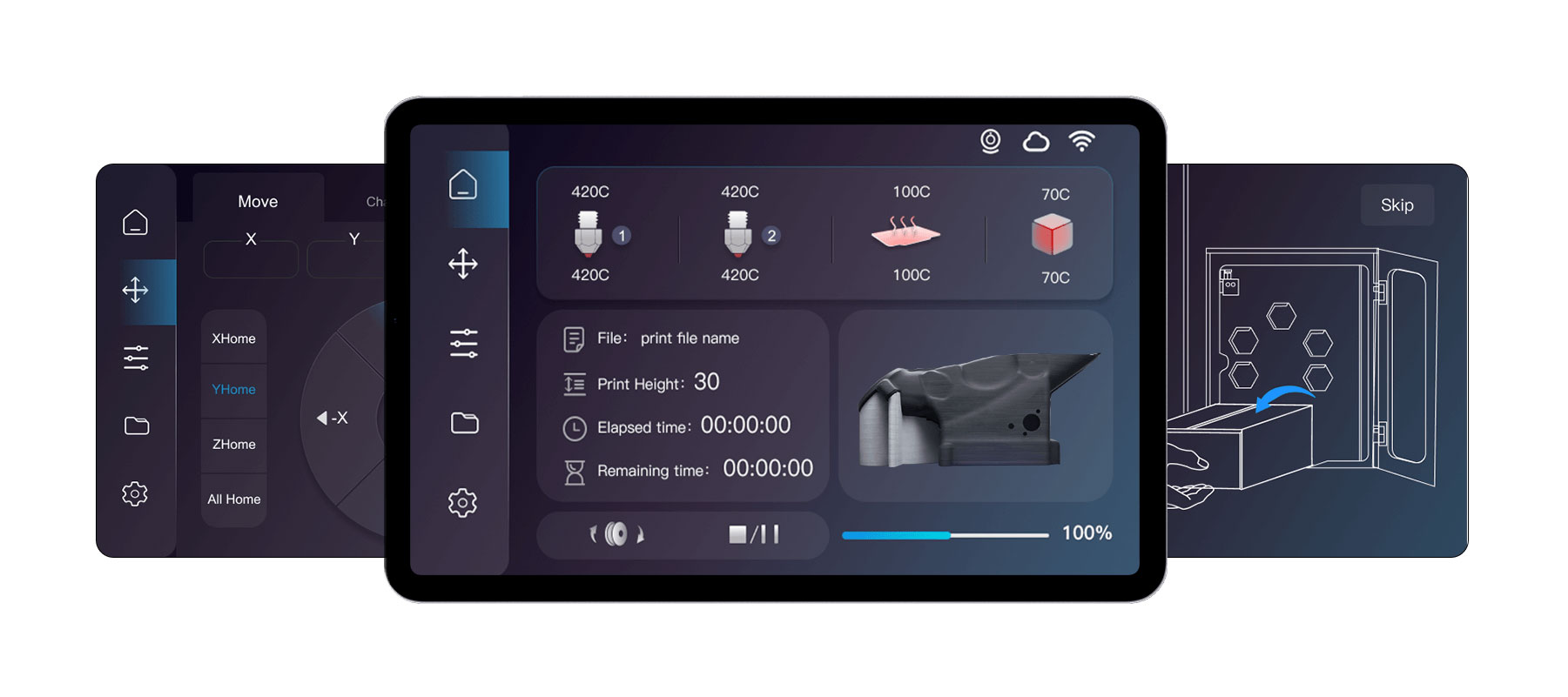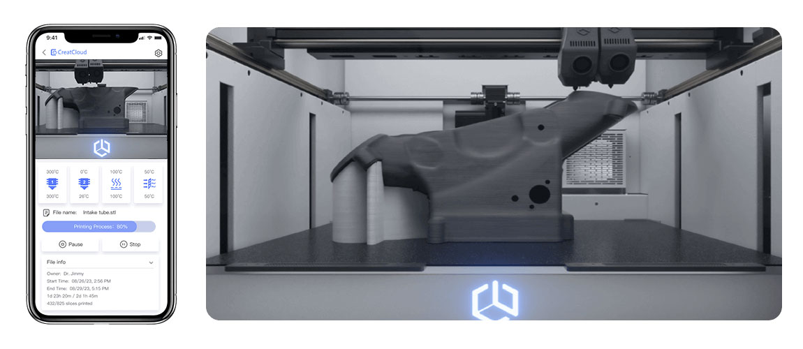Putem aplikacije moguće je u stvarnom vremenu upravljati brzinom, pauzama i temperaturama. Idealno za duge ispise i velike modele – napredak ispisa i kontrola procesa uvijek su na dohvat ruke.