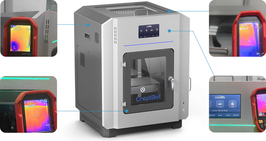 PEEK-250 prvi je desktop pisač koji postiže potpuno upotrebljivu komoru zagrijanu na 200 °C. Temperatura se podiže na 180 °C u samo 20 minuta – savršeno za PEEK-ispis i direktno žarenje unutar uređaja. Modeli se ne moraju vaditi, pomicati ili hladiti između koraka. Troslojna izolacija osigurava da vanjska temperatura ostane ispod 40 °C čak i nakon 5 sati rada. Idealan je za PEEK, PEI i sve materijale koji zahtijevaju kristalnu fazu i visoke okolne temperature.